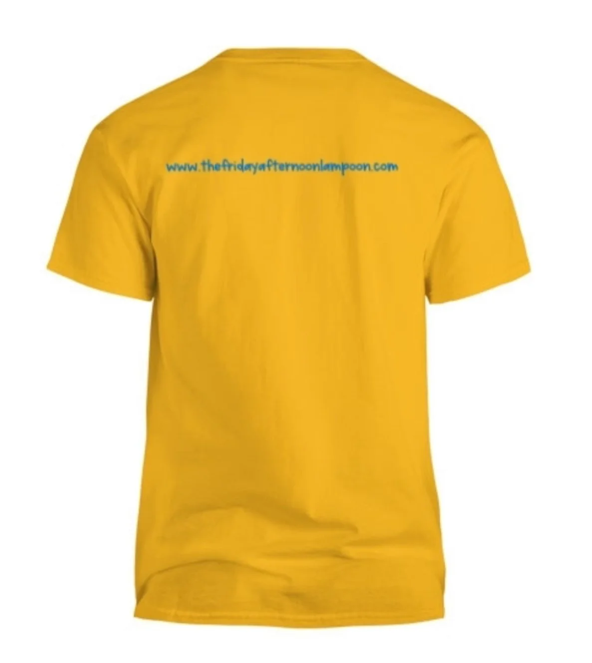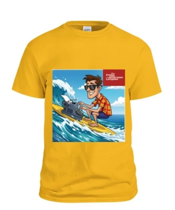 Yellow Shirt with a surfing journalist typing out a column while carving waves. On the back is the website. Different colors and sizes available.